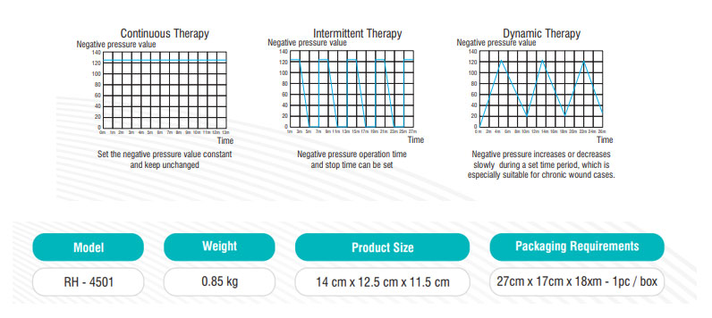 - Mode of operation : Countinuous Therapy, Intermittent Therapy, Dynamic Therapy, Intillation Therapy, Cleansing Wound Therapy. (Patients' therapy management)